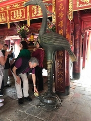 بازدید از اولین دانشگاه ویتنام اولین دانشگاه در ویتنام در هانوی در سال 1070 حدود 1000 سال قبل ساخته شده است در قرن 11 میلادی یک فرد چینی به نام Conjusian و شاگردانش مشاهده می شود که دانشگاه را بنا نهاد وخود از اساتید بود وتکس داشت و شاگردان برجسته اش همیشه همراه او بودند مجسمه استاد وشاگردانش میتوان دید ، دانشگاه در قرن 18 به موزه ادبیات تبدیل شده است . 2000 سال قبل هانوی دموکراسی داشتند وپادشاهی بوده است از آن ببعد 1000 سال چینی ها وبعد از آن فرانسوی ها حدود 100 سال 1858-1956 عکس درب دانشگاه اژدها که روی ماهی قرار دارد پرچم تمپل به رنگ قرمز نشانه آتش ، سبز نشانه درخت ، زرد نشانه آب ، بنفش نشانه فلز درب ورودی دانشگاه پرنده ای که روی لاک پشت قرار داده شده ولاک پشت ونشانه هم بستگی است که در طوفان وخطرات لاک پشت به پرنده کمک میکند که محفوظ بماند
