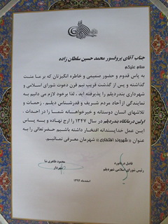 خبرگزاري فارس ارسال كرده، از استادش نوشته است. خاطره 219 در تاریخ جمعه چهارم محرم مطابق 17/8/1392 مجلس ومراسم عزاداری حضرت امام حسین (ع) در ساعت چهار بعد از ظهر در منزل اینجانب پروفسور سلطان زاده با شرکت عده ای از اساتید دانشگاه علوم پزشکی شهید بهشتی برگزار گردید ، سخنران جلسه حضرت آیت ا-- حسین مصطفوی بودند ، دراین مراسم عزاداری و مجلس باشکوه جناب آقای دکتر علی لاریجانی ریاست محترم مجلس شورای اسلامی وجناب آقای دکتر غلامعلی حداد عادل ریاست محترم سابق مجلس شورای اسلامی ونماینده فعلی مجلس وجناب آقای دکتر عباس پاک نژاد استاد دانشگاه –جراح ونماینده سابق مجلس شورای اسلامی که مدت 10 سال در اسارت جنگ تحمیلی بودند که در همان موقع اسارت دو برادر ایشان جزء 72 تن شهید شده بودند واقای دکتر علیرضا دیهیم نماینده سابق جمهوری اسلامی ایران در سازمان ملل ومقر سازمان ملل در ژنو بودند وآقای دکتر بیژن صدری زاده نماینده سابق سازمان بهداشت جهانی و آقای مجتبی مطهری فرزند شهید مطهری و نوه شهید مطهری وآقای عباسپور داماد شهید مطهری وآقای مهندس حمید کلانتری استاندار سابق یزد وجمعی از اساتید دانشگاه آقایان دکتر پیوندی ریاست دانشگاه علوم پزشکی شهید بهشتی –دکتر فریدون عزیزی رئیس سابق دانشگاه ورئیس موسسه پژوهشکده تحقیقات غدد مترشحه داخلی ، دکتر سید محمود طباطبائی مشاور وزیر بهداشت ورئیس سابق دانشگاه، دکتر مومن زاده مدیر سابق گروه اطفال دانشگاه ورئیس سابق بخش اطفال بیمارستان امام حسین ، دکتر محمد غفرانی رئیس سابق بیمارستان کودکان مفید ورئیس بخش فوق تخصصی اعصاب کودکان مفید ، دکتر سهراب پور ریاست بیمارستان شهید لبافی نژاد ،دکتر نوری صفا رئیس سابق دانشکده پزشکی شهید بهشتی ، دکتر طباطبائی رئیس بیمارستان امام حسین دکتر ناصحی رئیس سابق دانشگاه مازندران ، دکترسید مظفر حسنتاش قائم مقام سابق رئیس دانشگاه ورئیس سابق بیمارستان مسیح دانشوری،دکتر منصور بهرامی رئیس سابق بخش اطفال بیمارستان شهداء تجریش ، دکتر شوشتریان رئیس سابق بخش اطفال بیمارستان طالقانی، دکتر اخوین ریاست بیمارستان فرمانیه ، دکتر بلورساز دبیر انجمن پزشکان کودکان ، دکتر تقدیری فوق تخصص اعصاب اطفال بیمارستان مفید ،دکتر محمد علی جوادی مدیر گروه چشم پزشکی دانشگاه ، دکترمحمد علی رئیسی متخصص گوش وحلق وبینی رئیس و عضو هیئت علمی بیمارستان بقیه الله، دکتر شریفیان رئیس بخش فوق تخصصی کلیه اطفال بیمارستان مفید ، دکترمقدم نیا رئیس سابق بهزیستی ، آقای ظهیری مدیر عامل شرکت نفت و گاز ایران وعده ای دیگر شرکت داشتند. خاطره 220 در تاریخ 27/8/1392 بعد از 45 سال که از خدمت در بندر دیلم می گذرد روز بسیار بزرگی در زندگی من با اتفاق جالب توجه رخ داد وبه خاطره مهیج تبدیل شد ، در این روز آقای محمود طاهری نیا شهردارفعلی بندر دیلم ، آقای مهندس فاضل دریانورد رئیس شورای شهر بندردیلم ، آقای محمود شوشتری نایب رئیس شورای شهر بندردیلم ، آقای ایرانی از نخبگان در شورای شهر بندردیلم ، آقای ایوب ترک زاده فوق لیسانس مدیریت از کارمندان شهرداری با دسته گلی زیبا برای قدردانی از 45 سال قبل که در بندر دیلم به عنوان پزشک ورئیس بهداری انجام وظیفه نموده وبرای اولین مرتبه با کمک مردمی اولین درمانگاه را در بندر دیلم ساخته وتاسیس نموده بودم به مطب من آمدند که من به علت داشتن بیماران زیاد در بیماستان رسالت تهران آن روز دیر به مطب آمده ونتوانستم آن ها را ببینم ، لذا ساعت 10بعد از ظهر برای تشکر به هتل استقلال رفتم وهمگی خوشحال شدند واز من دعوت نمودند در اواخر بهمن یا اسفند در اجلاسی که از طرف شورای شهر در بندردیلم تشکیل خواهد شد شرکت نمایم ، آقایان گفتند شما در 45 سال قبل به پدران ما خدمت کردید وشورای شهر بندر دیلم می خواهد از شما قدردانی نمایندمن هم با خوشحالی قبول نمودم . تا کسی در خطه جنوب خدمت نکند نمی تواند خوبی این مردم را درک کند ، من به جرات می گویم مردم جنوب ایران وبخصوص بندردیلم از نظر خوبی وخون گ