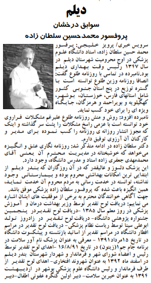 متن چاپ شده درباره پروفسور سلطان زاده و پیشرفت پلي كلينيك تخصصي و فوق تخصصي بندر ديلم در روزنامه طلوع بوشهر 30 تیر